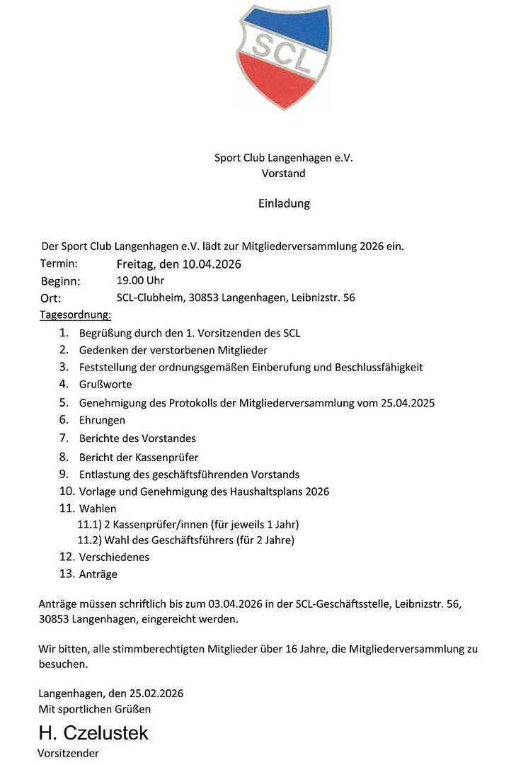 Einladung zur SCL-Mitgliederversammlung am 10.April 2026